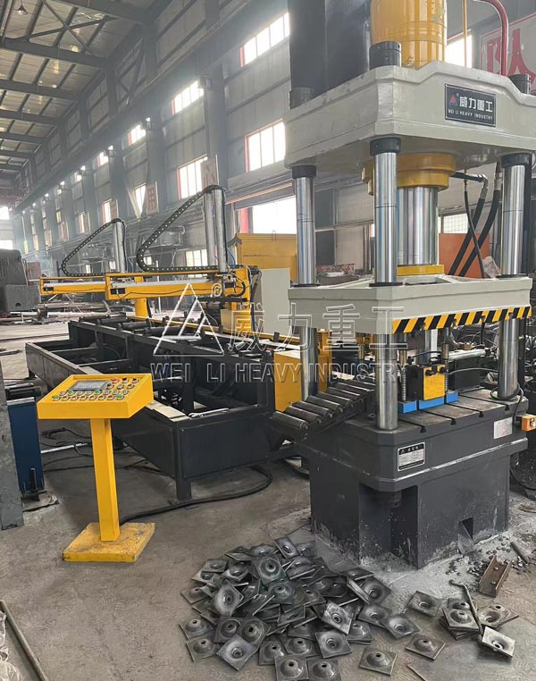 200噸錨桿托盤生產(chǎn)線采用智能化設(shè)備和技術(shù),使得生產(chǎn)過程更加精確和可控。是由磁力機(jī)械手抓取裁剪好的長板條,有自動送料機(jī)完成輸入工作,在由200噸錨桿托盤液壓機(jī)搭配模具,實(shí)現(xiàn)剪切、沖孔、壓型一次完成。此套錨桿托盤生產(chǎn)線很好的解決了最后一塊料的加工難題,避免了人工操作時打來的機(jī)械事故的發(fā)生。采用自動化沖壓機(jī)器進(jìn)行原材料加工和成型,自動機(jī)械化碼垛,消除了人工因素的干擾和誤差,保證了生產(chǎn)出的托盤質(zhì)量穩(wěn)定和一致。同時,還可以采用智能控制系統(tǒng)對生產(chǎn)過程進(jìn)行監(jiān)控和控制,以確保設(shè)備運(yùn)行的安全可靠和生產(chǎn)效率的最大化。